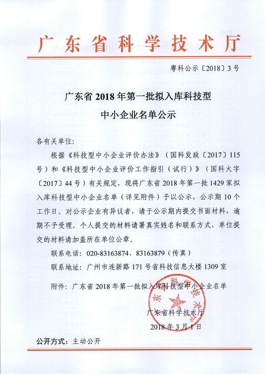 Recently, the provincial science and technology department made a public announcement on the list of the first batch of small and medium-sized enterprises in guangdong province to plan to enter into the library. There are 1,429 technology-based smes in the province, including 131 in jiangmen city. WIDE has been successfully selected for its excellent scientific research strength and scientific and technological innovation ability.